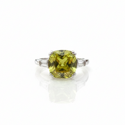 • Piedra central: Peridoto cultivado en laboratorio, corte cushion.
