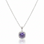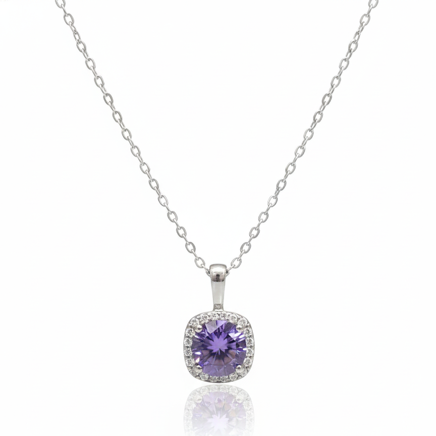 Este collar elaborado en plata .925 con baño de rodio destaca por su diseño geométrico y sofisticado. Al centro presenta una amatista en corte redondo, cuidadosamente engastada dentro de un halo de topacio blanco en forma cuadrada, creando un contraste armonioso entre líneas rectas y formas suaves que realzan el brillo y el color lila de la piedra.