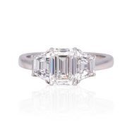 Un diseño lleno de elegancia y simetría. Este sofisticado anillo destaca por un diamante de laboratorio central corte esmeralda de 1.57qts, reconocido por su transparencia y líneas limpias, acompañado de diamantes laterales corte trapecio que aportan equilibrio y brillo excepcional.