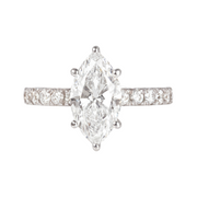 Un diseño majestuoso y lleno de brillo. Este anillo presenta un diamante de laboratorio central corte marquise de impresionante tamaño, acompañado por diamantes laterales que realzan su elegancia y luminosidad. Montado en oro blanco de 14k, es una pieza sofisticada y de carácter exclusivo.