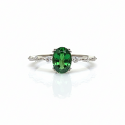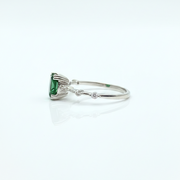Este anillo elaborado en plata .925 con baño de rodio es la definición de feminidad y detallismo. Su pieza central es una Esmeralda Ice cultivada en laboratorio en corte oval, cuya tonalidad verde vibrante y forma alargada estilizan la mano con una elegancia natural.
