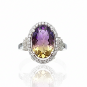 Este anillo elaborado en plata .925 con baño de rodio destaca por su brillo impecable y su diseño refinado. Al centro se encuentra una amatriana en corte oval, una combinación única de amatista y citrino que aporta un juego de colores vibrante y sofisticado. Su belleza se realza con un halo y laterales de topacio blanco, que añaden luminosidad y un contraste armonioso, creando una pieza elegante y llena de carácter.