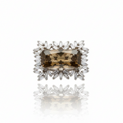 Este anillo elaborado en plata .925 con baño de rodio combina brillo, estilo y modernidad. En el centro destaca un topacio ahumado montado de forma vertical, una piedra reconocida por su tono cálido y elegante. Alrededor, un delicado halo de topacios blancos aporta luminosidad y realza el contraste de la pieza, creando un diseño sofisticado y versátil para cualquier ocasión.