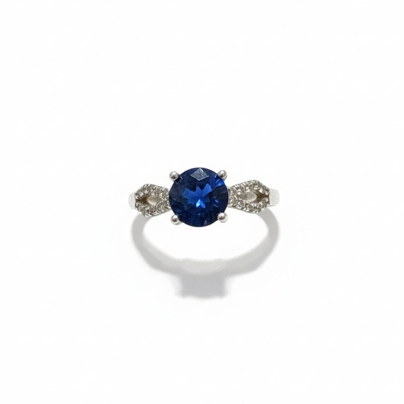 Este anillo elaborado en plata .925 con baño de rodio destaca por su diseño refinado y atemporal. Al centro presenta un zafiro en corte redondo, una piedra apreciada por su profundidad de color y su brillo elegante. La pieza se complementa con laterales de topacio blanco, que aportan luminosidad y un contraste armonioso, realzando la belleza del diseño con un acabado delicado y sofisticado.