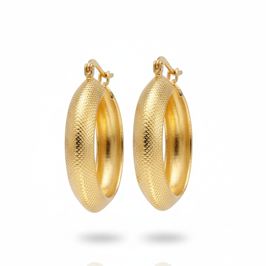 Estas arracadas destacan por su diseño moderno y elegante, realzado por un acabado biselado que aporta brillo y textura a la pieza. Su estilo versátil las convierte en un accesorio ideal para complementar tanto looks casuales como atuendos más formales.