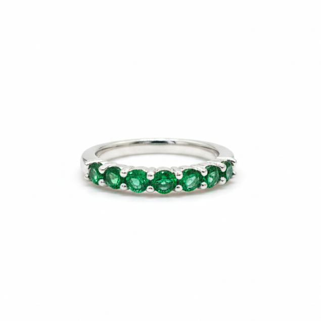 Esta churumbela elaborada en plata .925 con baño de rodio destaca por su diseño elegante y su brillo refinado. Está engastada con ocho esmeraldas cultivadas, cuidadosamente colocadas para crear una línea continua de color y luminosidad. Su diseño delicado y atemporal la convierte en una pieza ideal para usar sola o para combinar con otros anillos, aportando un toque sofisticado a cualquier look.