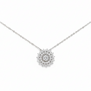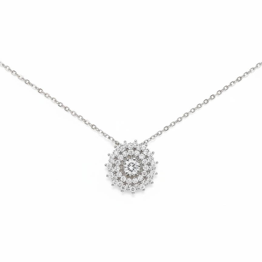 Este collar elaborado en plata .925 con baño de rodio presenta un delicado dije en forma de flor, adornado con piedras de topacio blanco que aportan un brillo armonioso y elegante. Su diseño floral transmite frescura y feminidad, convirtiéndolo en una pieza perfecta para iluminar cualquier look.