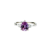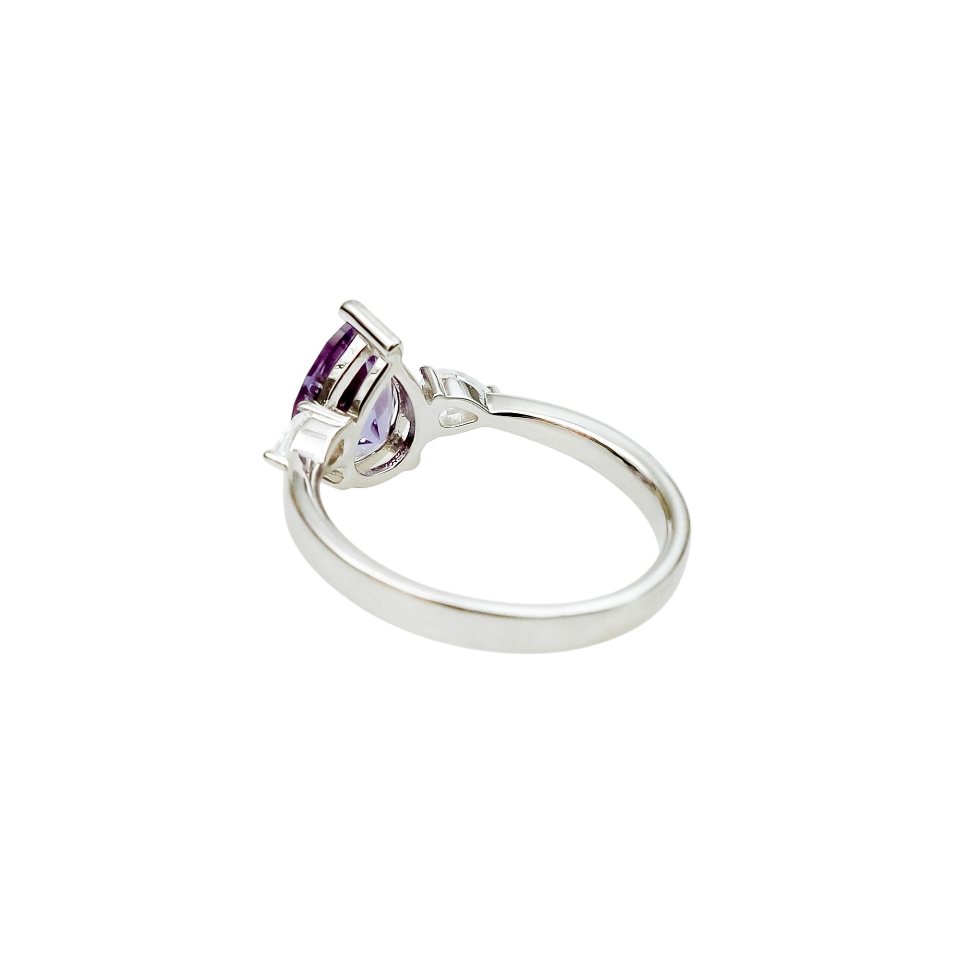Un diseño lleno de encanto y sofisticación. Este anillo destaca por su amatista central en corte pera, piedra reconocida por su tono púrpura intenso y elegante. A sus costados, topacios blancos en corte pera realzan el brillo y crean un contraste armonioso. Elaborado en plata .925 con baño de rodio, ofrece un acabado duradero y resplandeciente, ideal para llevar en ocasiones especiales o como pieza distintiva de uso diario.
