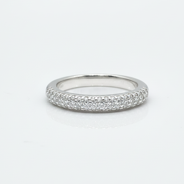Esta churumbela está elaborada en plata .925 con baño de rodio, ofreciendo un acabado brillante y resistente. Su diseño micropavé presenta moissanitas finamente engastadas, creando una superficie continua de destellos que aporta elegancia y sofisticación. Es una pieza versátil y atemporal, perfecta para usar sola o combinar con otros anillos, ideal para realzar cualquier estilo con un toque de lujo discreto.