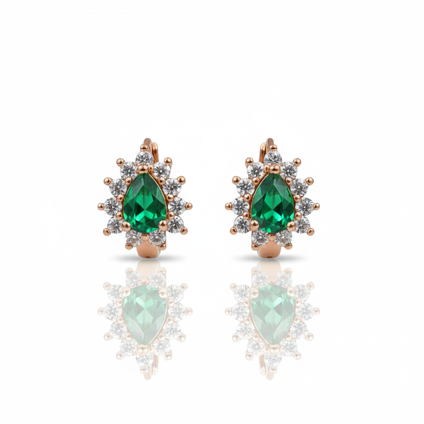 Estos huggies elaborados en chapa de oro presentan un elegante diseño en forma de gota, protagonizado por una piedra central color verde, rodeada por zirconias blancas que realzan su brillo y sofisticación. Su estilo delicado y luminoso los convierte en una pieza ideal para aportar un toque de color refinado a cualquier look.