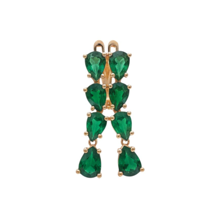 Estos huggies elaborados en chapa de oro presentan un elegante diseño adornado con cuatro zirconias color verde en corte gota, que aportan brillo y un toque de color sofisticado. Su tamaño equilibrado y largo de 1.5 cm los convierte en una pieza ideal para destacar de forma sutil y elegante.