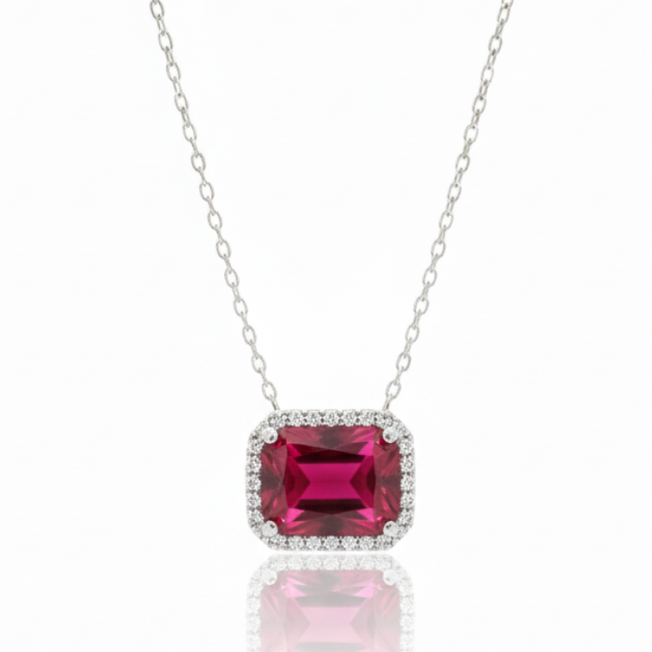 Este collar elaborado en plata .925 con baño de rodio es la definición de elegancia majestuosa. Su pieza central es una deslumbrante piedra cultivada en laboratorio de color Fucsia intenso (Rubí) en corte esmeralda (rectangular), que captura la mirada con su profundidad y tono apasionado.