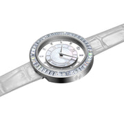 Sofisticación pura y brillo atemporal. Este reloj de CIGA Design es la definición de la elegancia minimalista. La combinación de la piel blanca impecable con el resplandor de los cristales claros crea una pieza que transmite frescura y lujo discreto. Es el accesorio ideal para la mujer que busca una pieza versátil que ilumine su estilo diario con una distinción única.