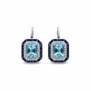 Elegantes y sofisticados, estos aretes están elaborados en plata .925 con baño de rodio, destacando por su piedra central de blue diamond cultivado en laboratorio. Su brillo se realza con un primer halo de topacios blancos y un segundo halo de topacios azules, creando un contraste único lleno de luz y color. Una pieza refinada, ideal para ocasiones especiales o para darle un toque de distinción a tu estilo diario.