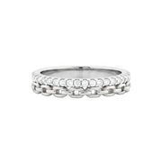 Esta churumbela está elaborada en plata .925 con baño de rodio, ofreciendo un acabado brillante y duradero. Su diseño combina dos estilos en una sola pieza: una hilera superior con diseño tipo cadena y, en la parte inferior, una línea continua de moissanitas, creando un contraste moderno y sofisticado. Esta combinación aporta textura, brillo y un carácter distintivo, ideal para quienes buscan una joya versátil y diferente.