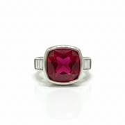 • Piedra central: Rubí de 1.2 cm x 1.2 cm, rodeado por un halo de topacios blancos en corte baguette que maximizan su brillo.