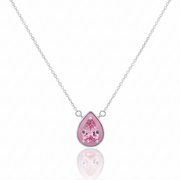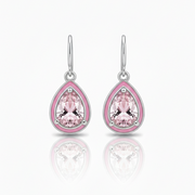 Ambas piezas (dije y aretes) presentan la sofisticada forma de gota (corte pera), con una piedra rosa cultivada en laboratorio como protagonista. Siguiendo la tendencia monocromática, cada gema está abrazada por un fino borde de esmalte rosa que iguala su tonalidad exactamente. Es el dúo perfecto para quien busca un estilo moderno, limpio y lleno de feminidad.