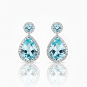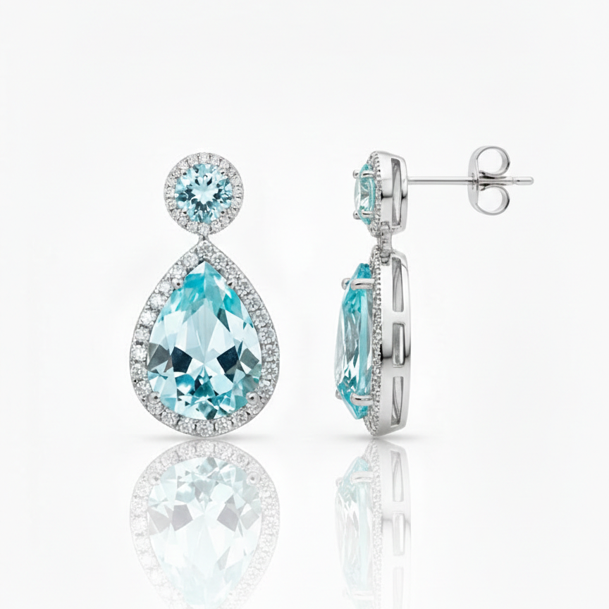 En la parte superior, los aretes cuentan con una piedra redonda con halo de topacio blanco, que crea un efecto clásico y refinado. En la parte inferior, se integra una piedra Blue Diamond en corte gota, también rodeada por un halo de topacio blanco, aportando movimiento y un acabado de joyería fina que realza la silueta del diseño.