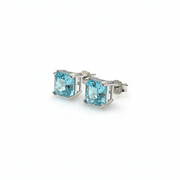 Estos aretes elaborados en plata .925 con baño de rodio destacan por su diseño minimalista y su brillo refinado. Al centro presentan un topacio azul cultivado en laboratorio en corte princess (cuadrado), apreciado por su tonalidad azul vibrante y su excelente luminosidad, que aporta frescura y sofisticación a la pieza.
