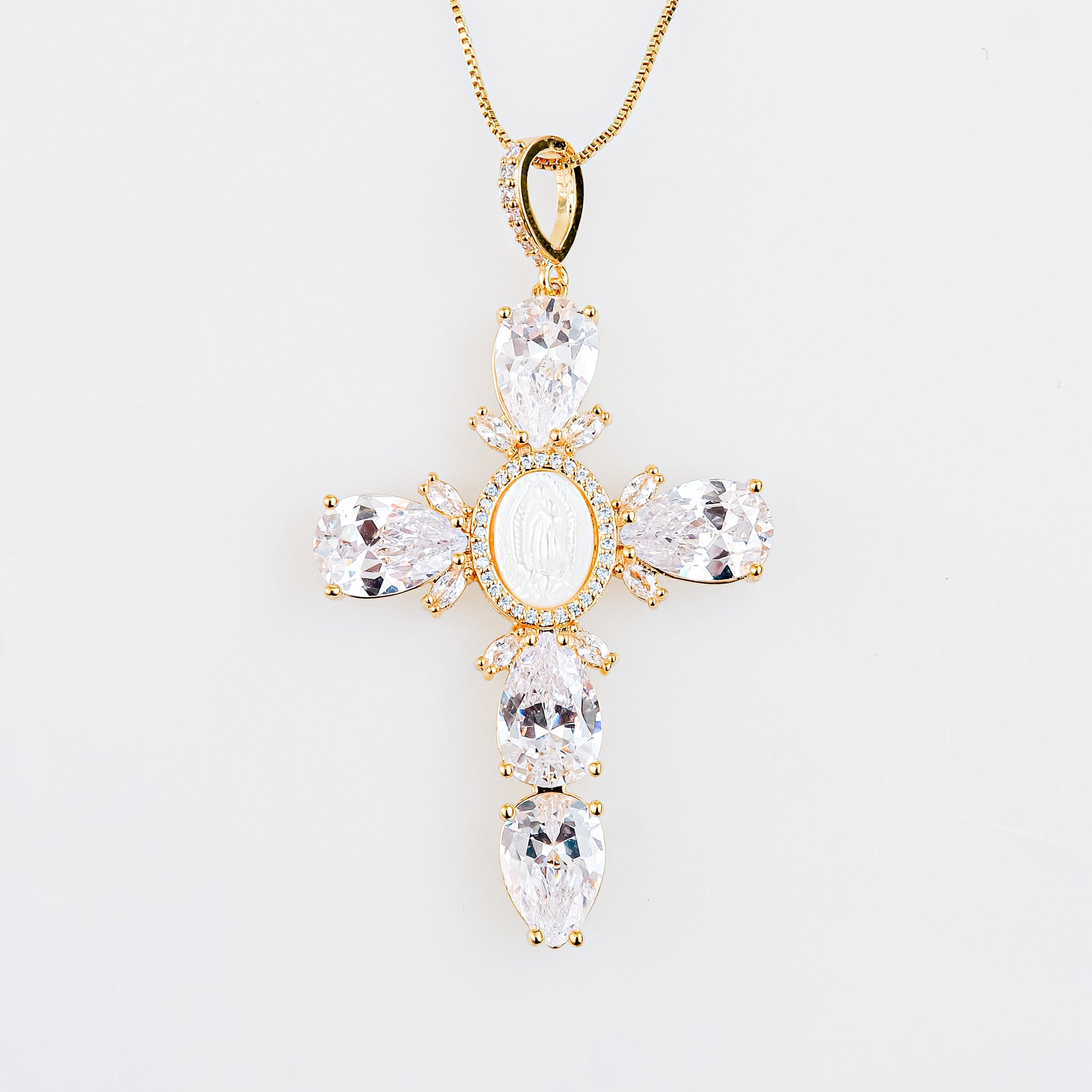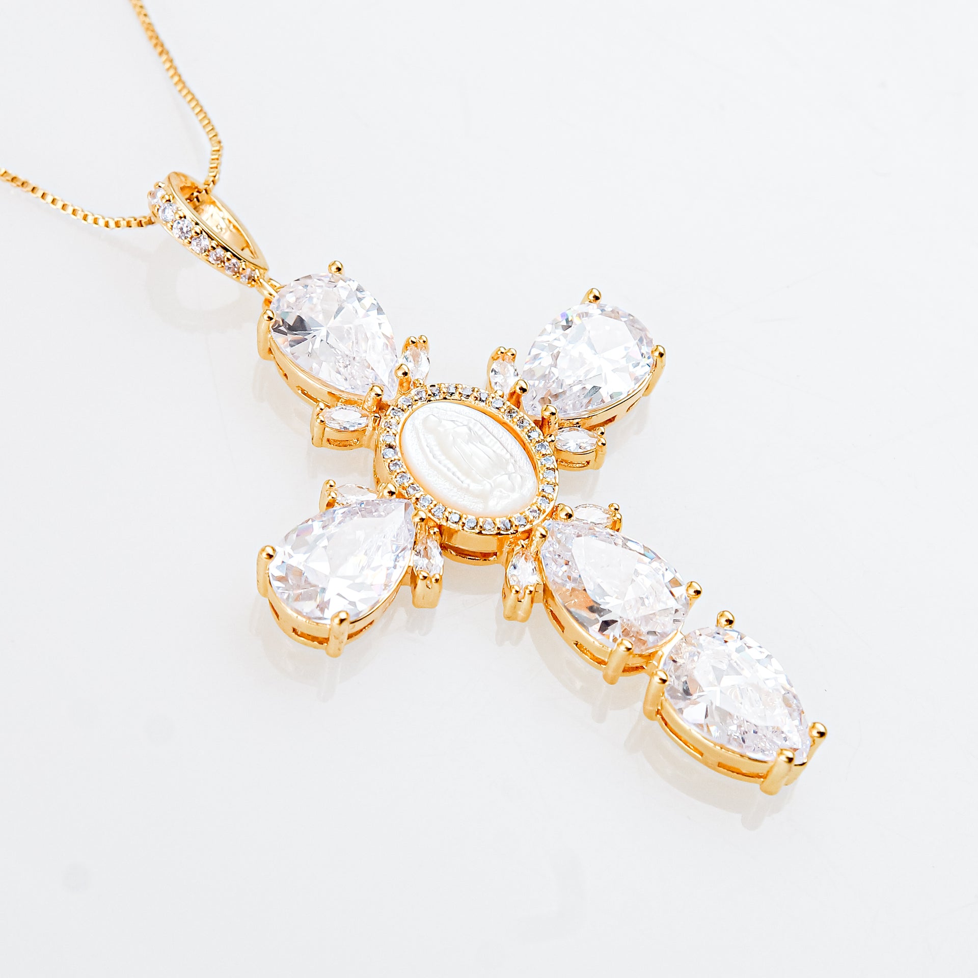 Esta cruz de chapa con baño de oro es una joya única que combina belleza, espiritualidad y sofisticación. En el centro de la cruz se encuentra una delicada imagen de la Virgen María, rodeada por zirconias pequeñas que resaltan su figura con un resplandor sutil. En los cuatro puntos de la cruz, zirconias AAA están cuidadosamente incrustadas, aportando un brillo adicional y completando el diseño con un toque de lujo. El centro de la cruz está adornado con concha nácar, creando un hermoso contraste que aporta un toque de luminosidad natural.