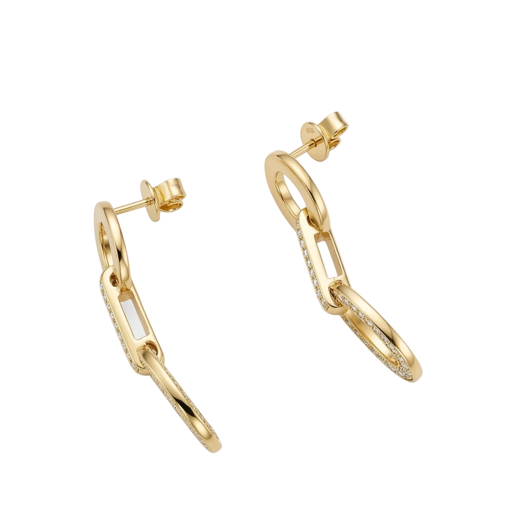 El collar destaca por su diseño de doble capa integrado: una cadena corta tipo gargantilla que se ciñe delicadamente al cuello, y una segunda cadena más larga con un dije central que aporta profundidad y movimiento. Para completar el look, los aretes están engastados con moissanitas cultivadas, famosas por tener un índice de refracción incluso superior al del diamante, garantizando que cada destello ilumine tu rostro.