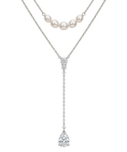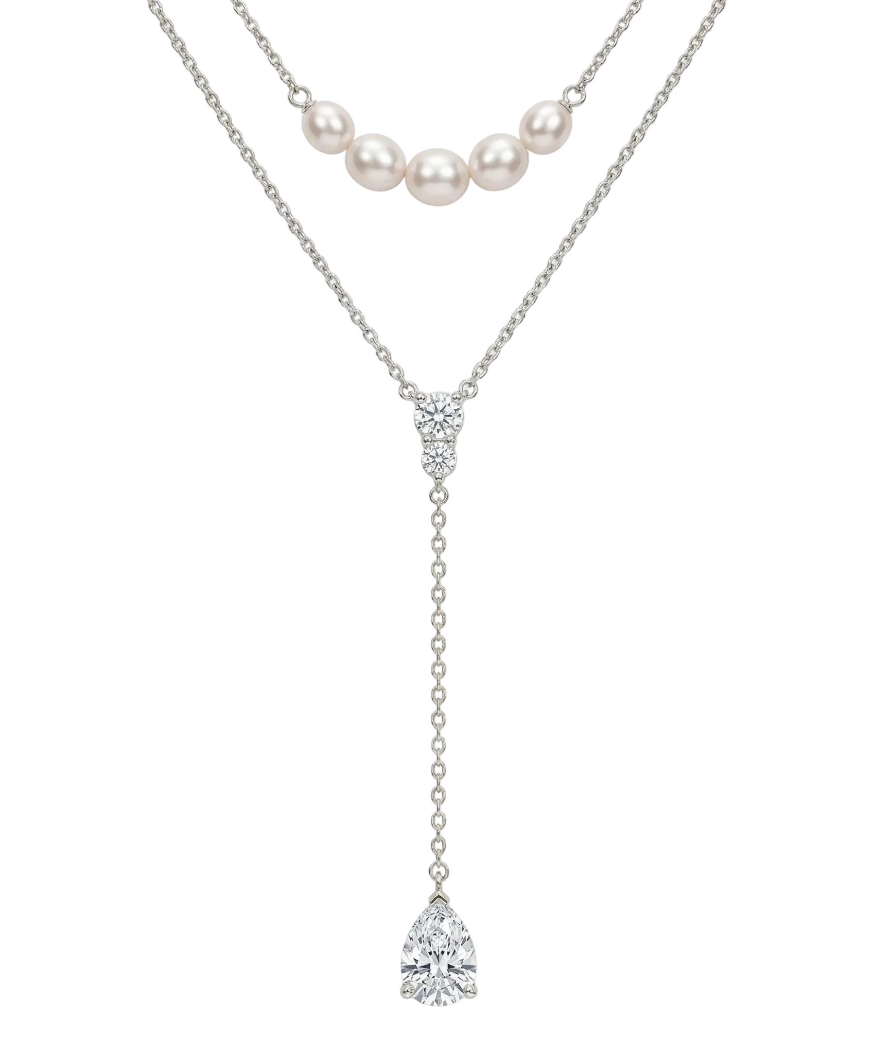 El collar presenta un diseño de doble capa integrado: una cadena superior estilo gargantilla adornada con perlas sinteticas que aportan una luz delicada y precisa, y una segunda cadena más larga que sostiene varias piedras de topacio blanco que dan un  acabado perfecto. Por su parte, los aretes de caída armonizan el conjunto, utilizando la misma combinación de topacio y perla para enmarcar el rostro con suavidad y luz.