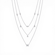 El collar ofrece tres niveles de caída perfectamente coordinados que evitan enredos, mientras que los aretes a juego aportan una simetría impecable, enmarcando el rostro con destellos nítidos. Gracias al baño de rodio, las piezas mantienen un acabado tipo espejo que realza la transparencia de las gemas.