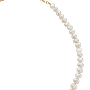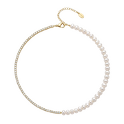 Collar: Cadena de plata dorada que integra la transparencia del topacio con la suavidad de la perla.
