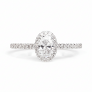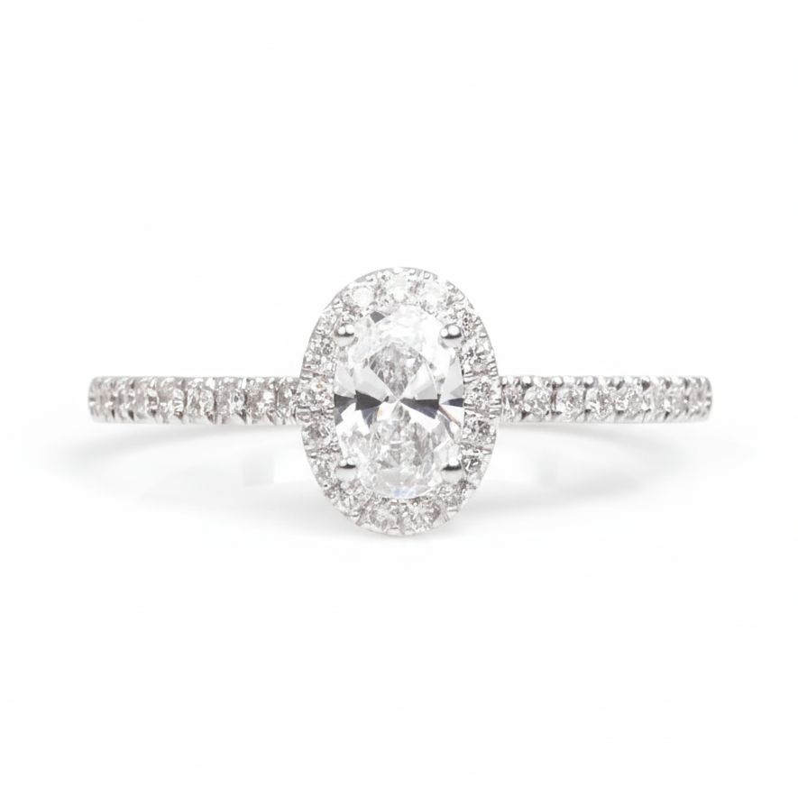 Un diseño clásico y refinado elaborado en oro blanco de 14k, con un diamante de laboratorio en corte oval al centro y diamantes laterales en corte redondo que realzan su brillo excepcional. Una pieza que combina elegancia y sostenibilidad.