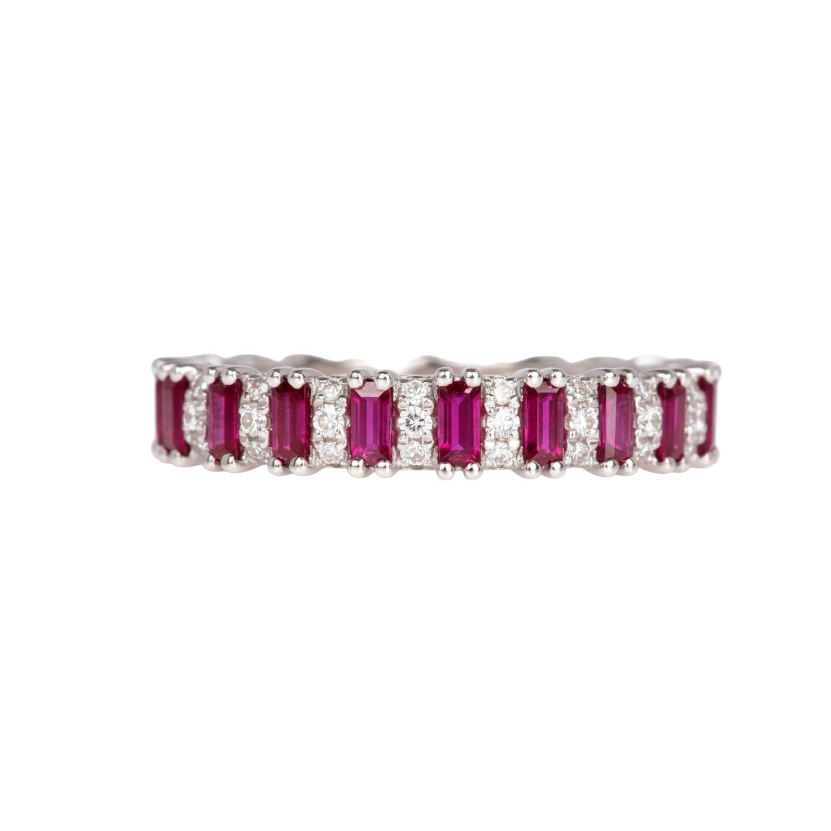 Este anillo está finamente elaborado en oro blanco de 14 quilates, ofreciendo una estructura sólida, elegante y de alto valor ornamental. La pieza está protagonizada por un rubí natural de 0.55 quilates, tallado en corte esmeralda, el cual destaca por su tonalidad roja profunda y su extraordinaria claridad óptica.