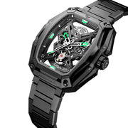 Contrastes Electrizantes: Detalles en verde neón en las manecillas y marcadores que rompen la estética "Total Black", facilitando la lectura y aportando un aire deportivo y futurista.