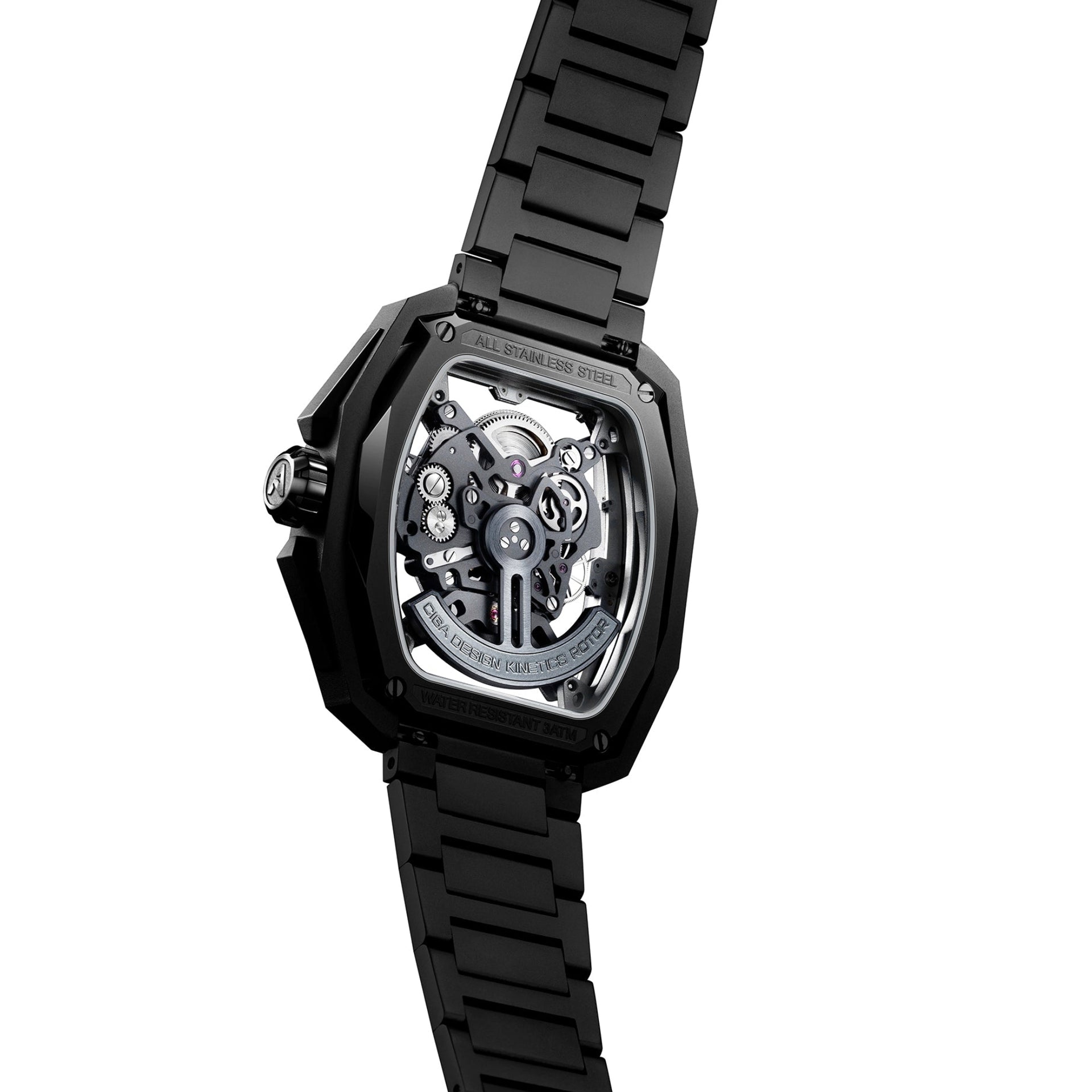 Caja Skeleton de Vanguardia: Una estructura robusta en color negro mate que enmarca el movimiento expuesto, permitiendo ver cada engranaje y muelle en acción.