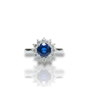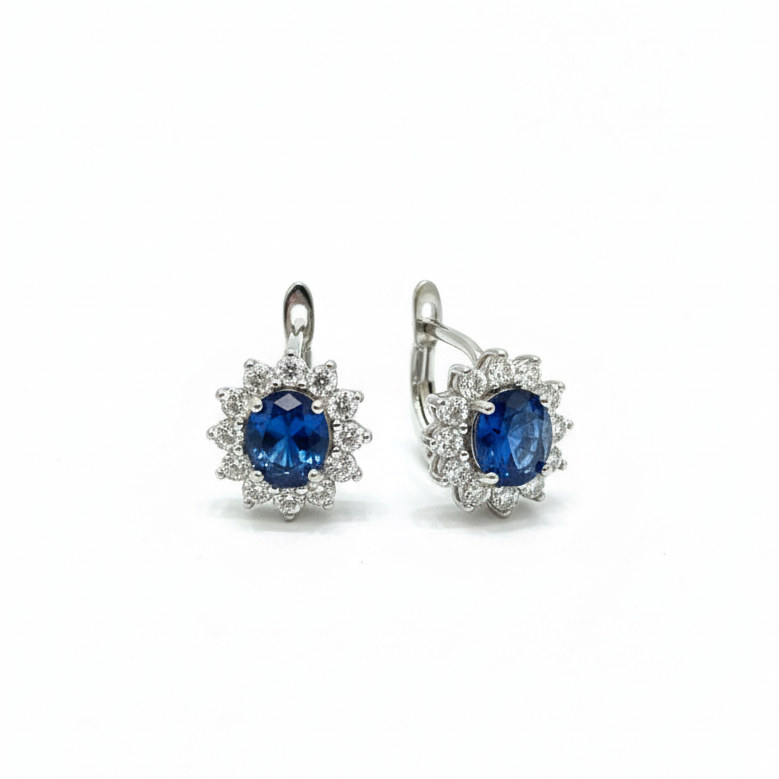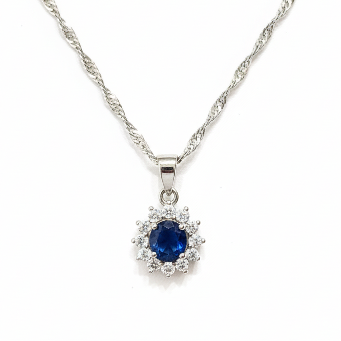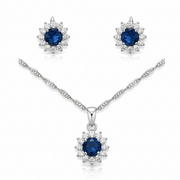 Este elegante set elaborado en plata .925 con baño de rodio destaca por su diseño luminoso y sofisticado. Cada pieza presenta un diseño tipo sol o flor, con un zafiro central como protagonista, rodeado por un halo de topacio blanco que aporta brillo y realza la forma del diseño.