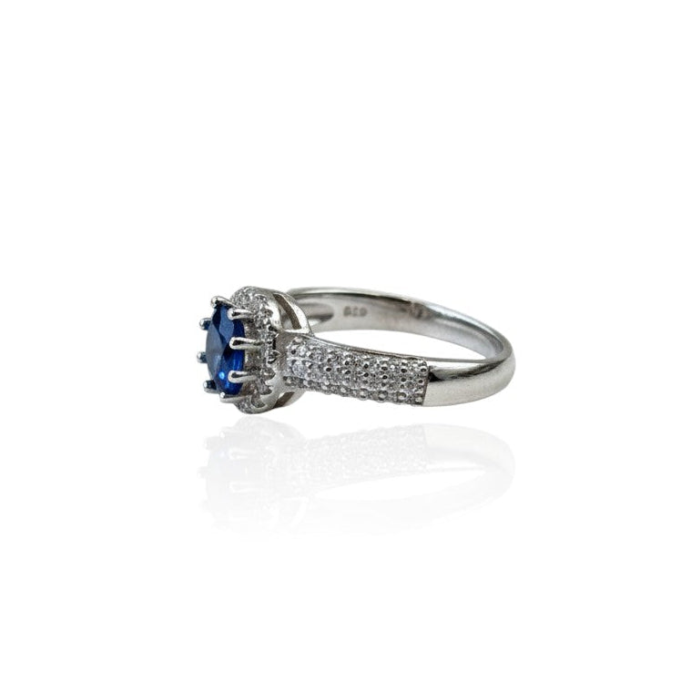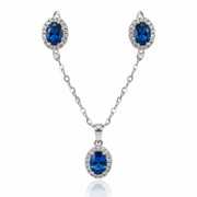 Este elegante set elaborado en plata .925 con baño de rodio destaca por su diseño armónico y su brillo sofisticado. El protagonista es un zafiro central en corte oval, montado en una elegante montadura de 8 uñas, que permite resaltar al máximo la luminosidad de la piedra. Cada pieza se realza con un halo de topacio blanco, aportando destellos delicados y un acabado de joyería fina.