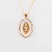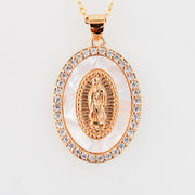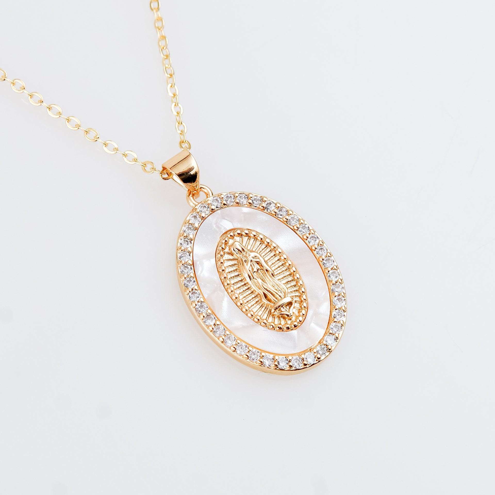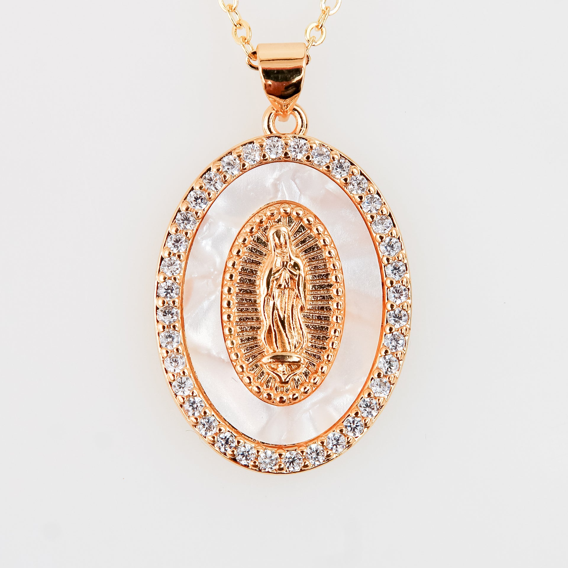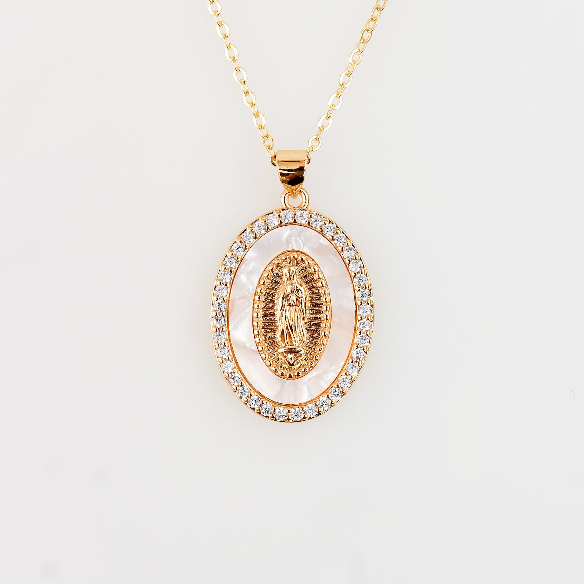 Collar Ovalado con Virgen María, Zirconias AAA, Concha Nácar y Baño de Oro de 18k