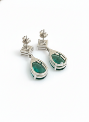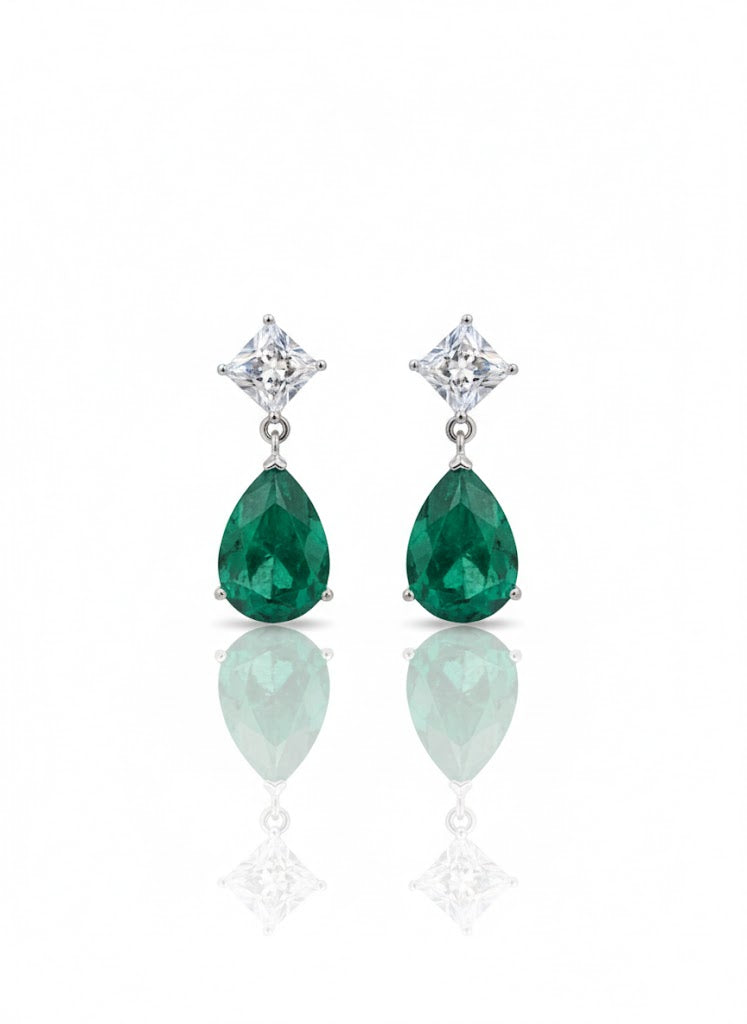 En la parte superior presentan un topacio blanco en corte princesa, que aporta luminosidad y un toque moderno. En la parte inferior destacan con una esmeralda en corte pera, que añade color, elegancia y un estilo refinado al diseño.
