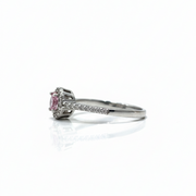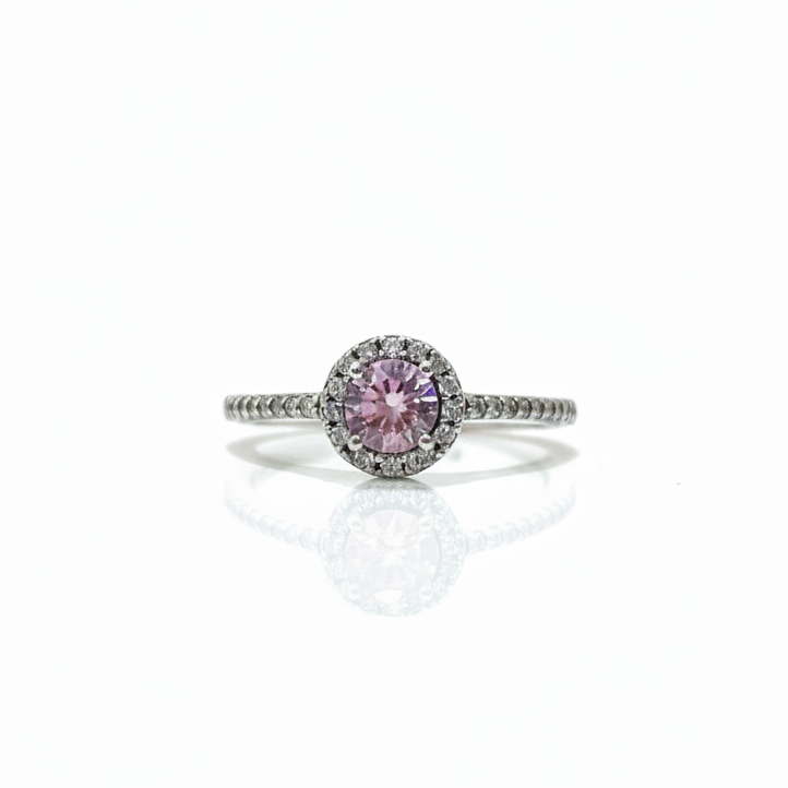 La joya presenta un zafiro rosa de corte redondo como piedra central, cuidadosamente engastado para resaltar su tono suave y brillante. El diseño se realza con un halo de topacio blanco que enmarca el zafiro, aportando luz y contraste. Además, los laterales del anillo están decorados con topacios blancos, creando un destello continuo que eleva la elegancia del diseño.