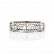 • Diseño: Tres hileras — dos de moissanitas redondas y una central de moissanitas baguette.