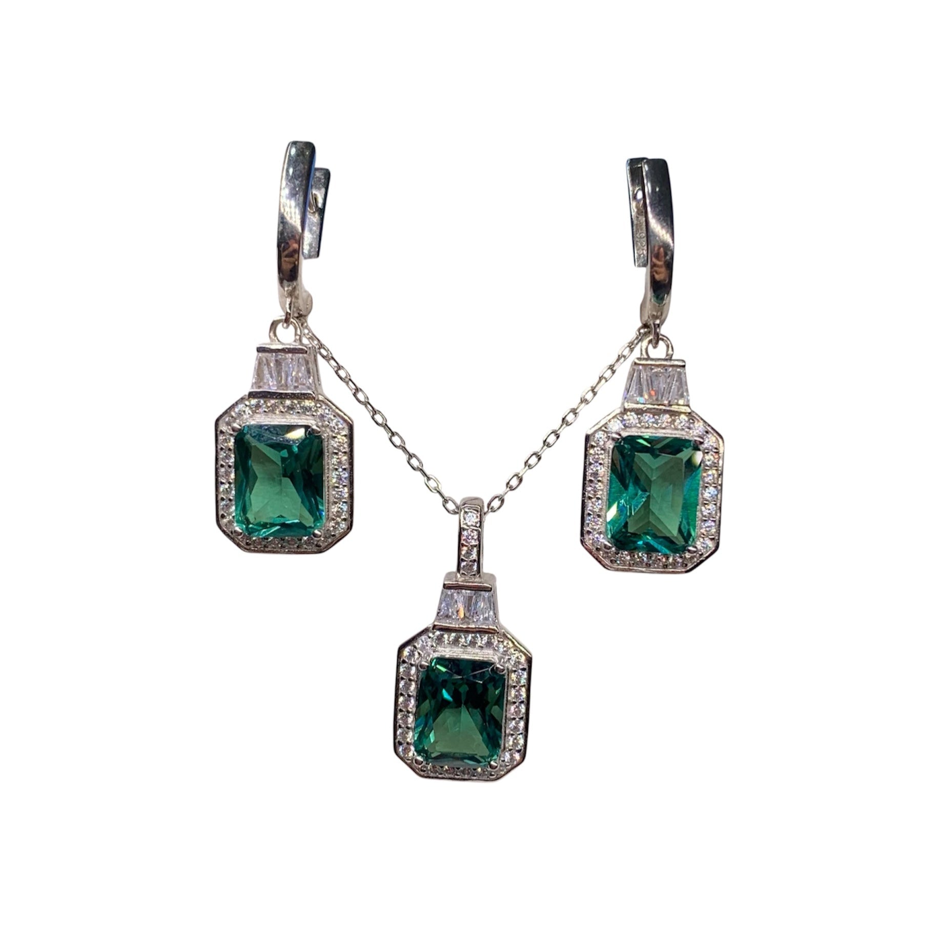 Este elegante set combina la magia de la alejandrita cultivada, reconocida por su fascinante efecto de cambio de tonalidad, con el brillo sutil de los topacios blancos. Elaborado en plata .925 con baño de rodio, ofrece un acabado brillante y duradero.