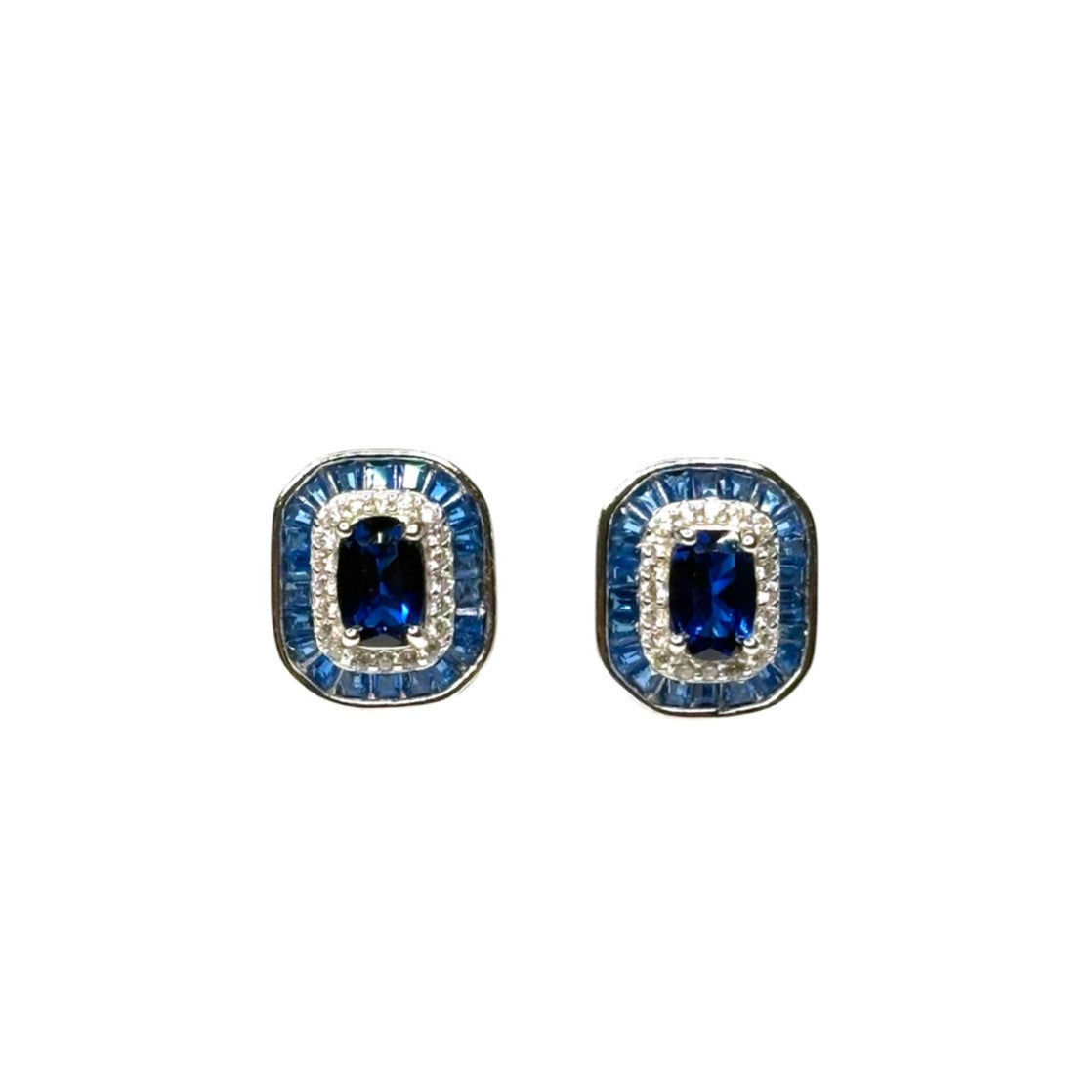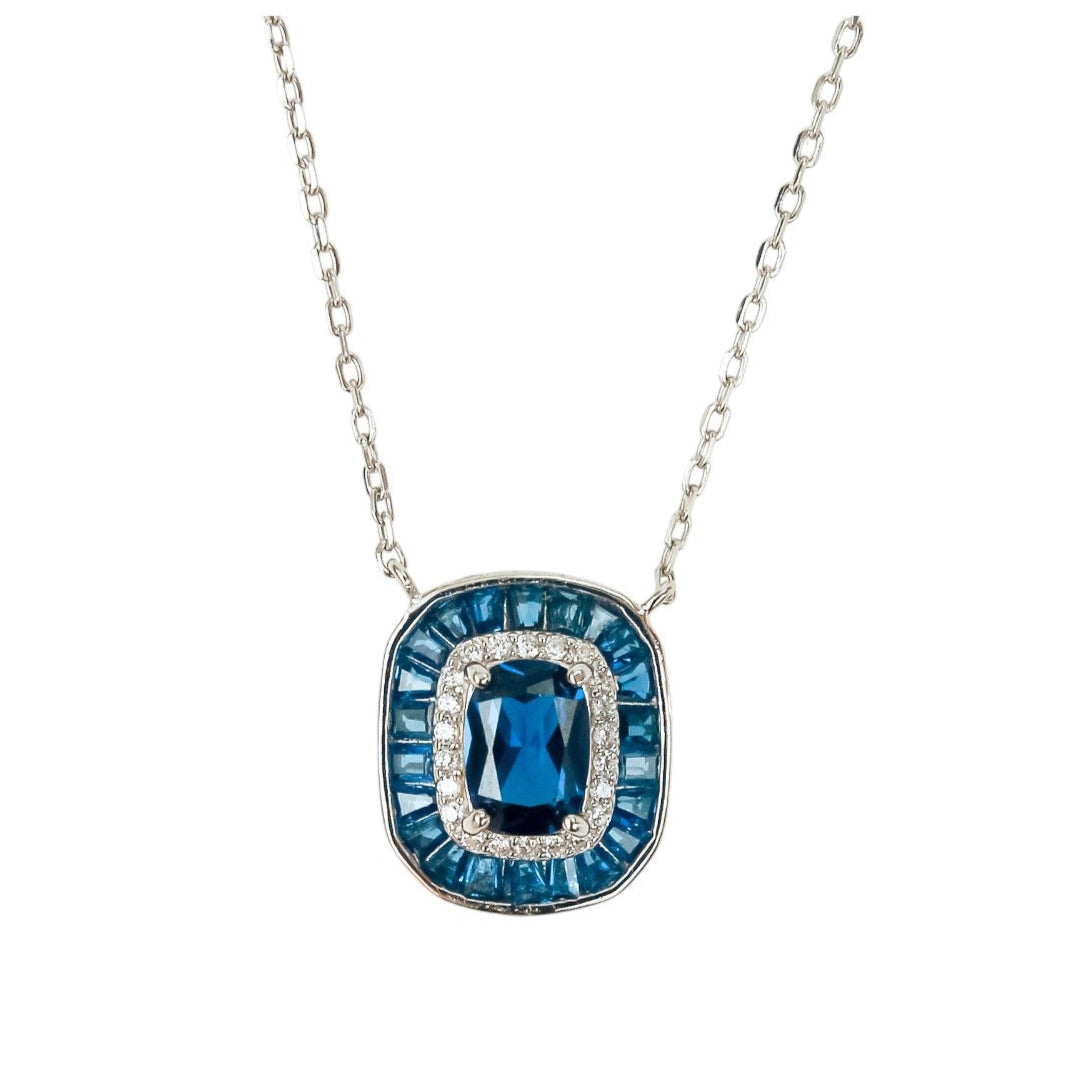 Un set lleno de distinción y brillo, compuesto por collar y aretes que combinan elegancia y diseño sofisticado. Cada pieza cuenta con un zafiro central en corte esmeralda, rodeado por un delicado halo de topacios blancos y un segundo halo de zafiros en corte baguette, que realzan aún más su color y resplandor.