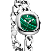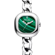 La esencia de la naturaleza en un diseño de vanguardia. Este modelo de CIGA Design destaca por su hipnotizante dial que imita las vetas naturales de la malaquita, creando un contraste espectacular con el brillo pulido del acero. Es la pieza perfecta para la mujer que busca un accesorio con personalidad propia, equilibrio y un toque de misterio.