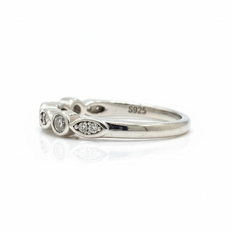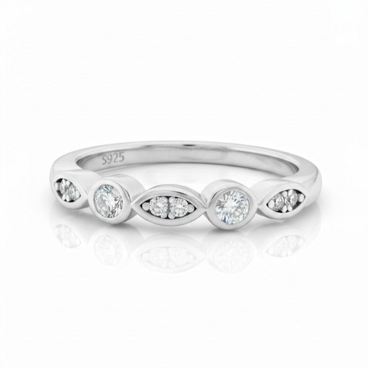 Moderna y brillante, esta churumbela de moissanita destaca por su diseño único con figuras alternadas en forma de rombo y circular, creando un patrón armónico y sofisticado. Cada silueta cuenta con una o dos moissanitas finamente incrustadas, ofreciendo un brillo excepcional desde cualquier ángulo.