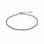 Esta pulsera elaborada en plata .925 con baño de rodio destaca por su diseño fino y femenino, ideal para quienes buscan una joya sutil con un toque de color suave. A lo largo de la pieza se encuentran amatistas en tono lila, cuidadosamente seleccionadas para aportar un brillo delicado y una estética armoniosa.