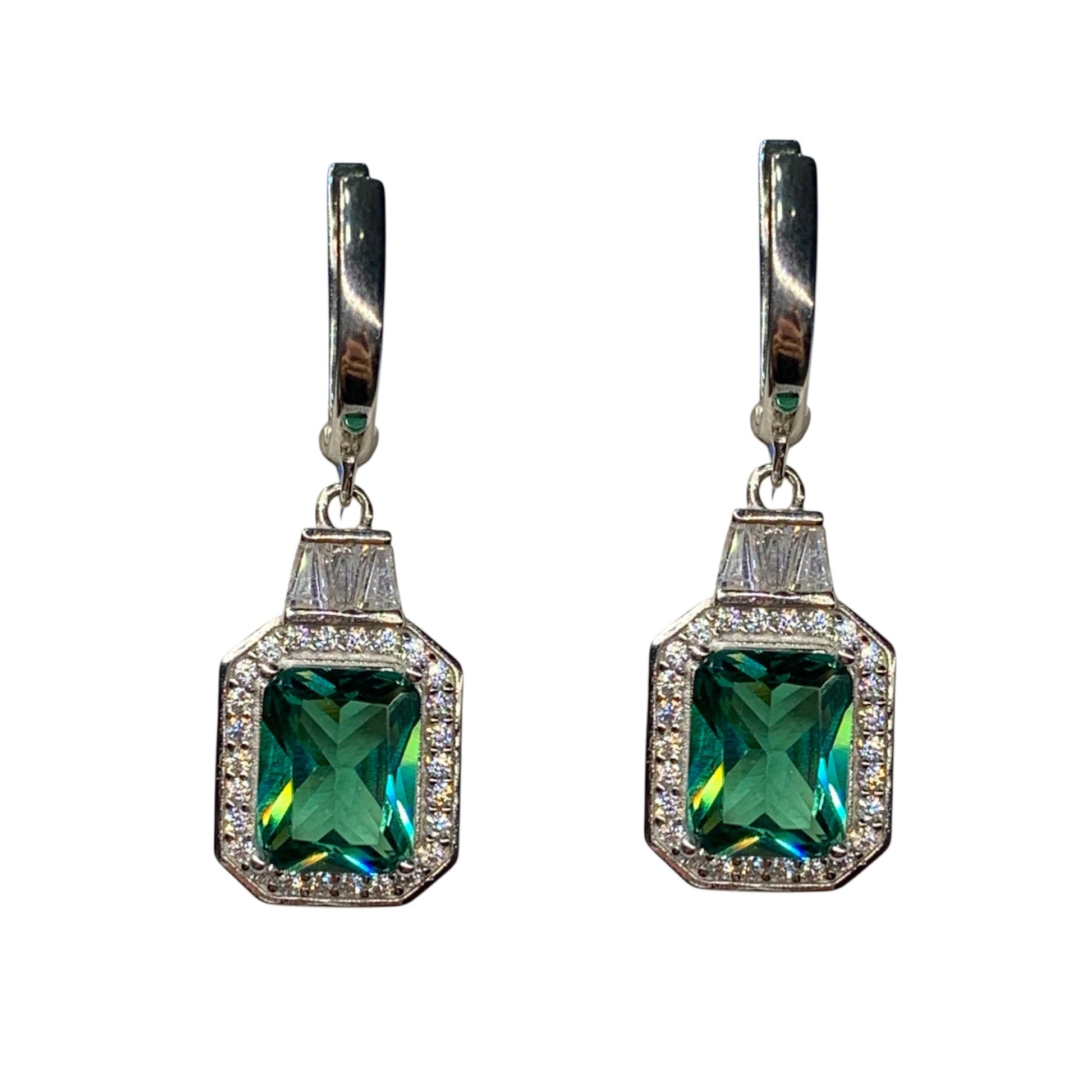 Aretes: Diseño tipo huggies, rectangulares con central de alejandrita y halo de topacios
